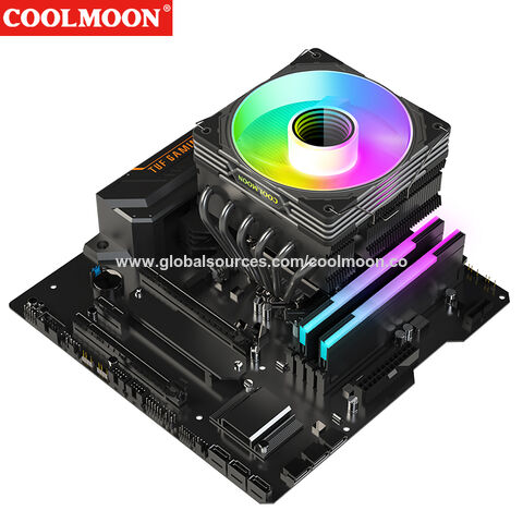 For gaming PCs, Coolmoon Electronics (Dongguan) Co. Ltd’s CM-T600-B is a downdraft CPU fan with a heat sink, six heat pipes and fluid dynamic bearings. It is compatible with Intel socket LGA115X, 1200, 1366, 1700, 2011 or 2066 and AMD Socket AM5 or AM4.