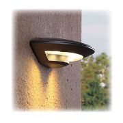 This black fixture and its 6V, 1.5W solar panel, with ABS housings, can be tilted up and down up to 180 degrees. It has a 2,200mAh lithium battery and a night sensor. Charging time is 6 to 8 hours and operating time is 7 hours on a high brightness setting and 14 hours on low.