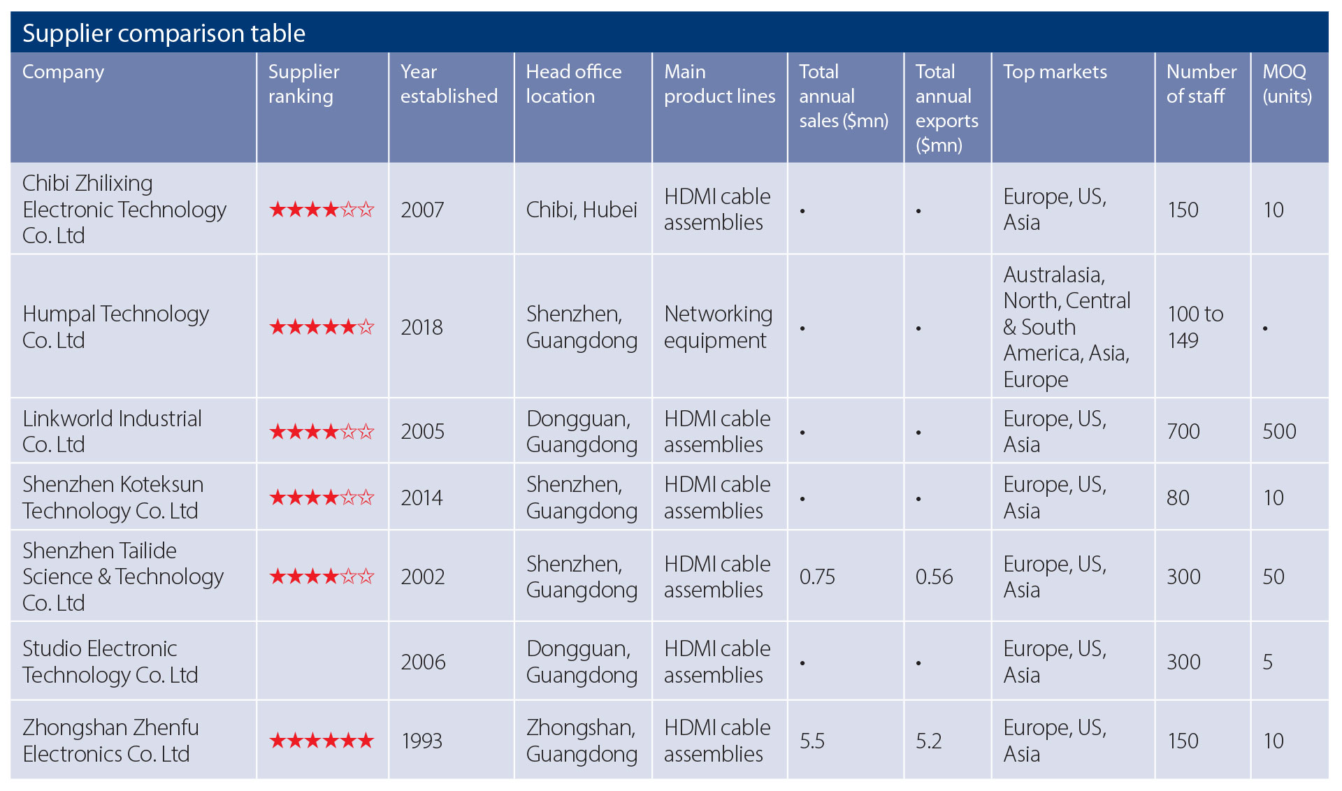 Hundreds of suppliers make up the HDMI cable assembly production segment in China, with over half offering fiber-optic types. YOFC, Choseal, UGREEN and Kaiboer are some of the major Chinese players in the HDMI category. There are also foreign companies with factories in China. They include Phillips, Belkin and Wireworld.