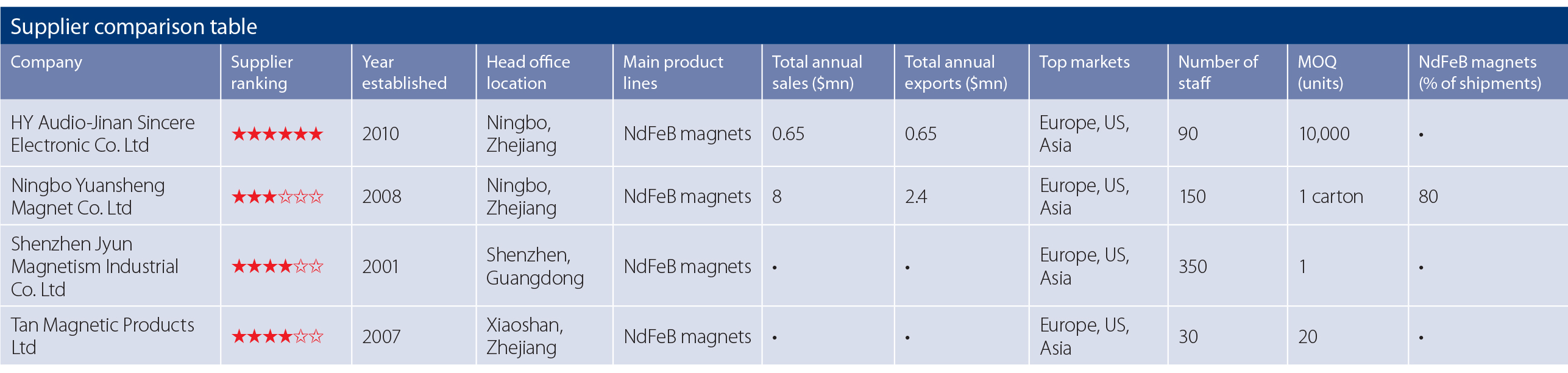 Besides the green energy market, one other sector Chinese suppliers are targeting is audio equipment. Magnets are widely used in headphones, speakers and microphones. Ferrite or ceramic types, mostly in grades of Y25, Y30 and Y35, are mainstream for their low costs, especially in applications with no space limitations.