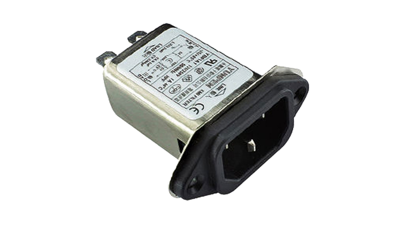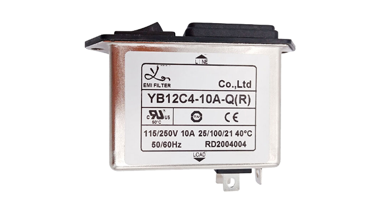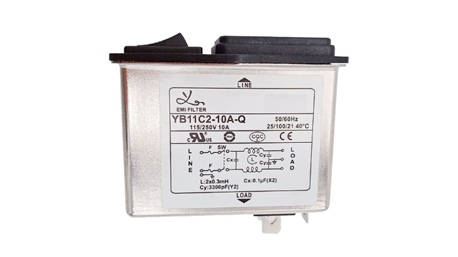 An EMI filter, the YB11C2-10A-Q from Shenzhen Win-Kare has a rating of 115/250VAC, 10A and an operating temperature of -25 to 85 C. It is CE-approved and UL-listed.