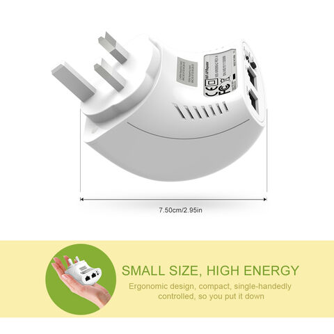 The repeater includes one Ethernet LAN port and one Ethernet WAN port, both of which support speeds up to 100Mbps. It features a WPS button for secure connections and a mode switch to change between router, AP, and repeater modes. It comes in a wall plug design.