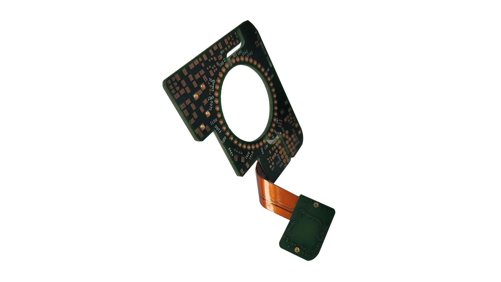 Huizhou Xindayuan’s three-layer rigid-flex PCB, the XDYRF0013B, uses FR-4 and copper materials and has an immersion gold surface finish, green solder mask and 3±0.03mm board thickness.