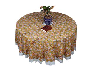 Made of cambric cotton, this 05 table cover from Vandana Handicraft has hand-block Jaipur print with floral motifs in azo-free light green and yellow. It is available in rectangular and round shapes, and 60x60in, 60x90in or custom size.