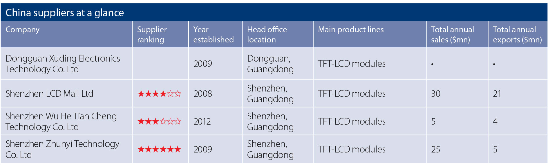 There are more than 500 suppliers of 3 to 10in TFT-LCD modules in China, nearly 70 percent of which are homegrown enterprises. All, including foreign-invested companies, offer other sizes too.
