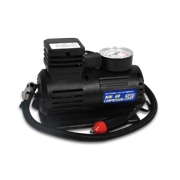 The 93308 from Shenzhen ATR Industry Co. Ltd is a metal air compressor with a pressure of 150psi. It has a 30mm steel cylinder, a built-in pressure gauge and an optional 1.5mm PU-coiled hose or 0.7mm rubber hose. Operating current is 13 to 15A/min, peaking at 16A/min. Power is drawn from a 12 or 24VDC supply. A sports needle and two nozzle adapters are included.