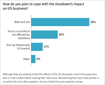 For China exporters that are already feeling the effects of the shutdown, the most conspicuous and immediate impact is the drop in recent orders from the US. Buyers there reduced purchases, wary of a slowdown in sales. Some suppliers have even experienced protracted deliveries and cancellations.