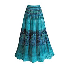 In the skirts handpicked by our market analyst Naheed Siddiqui below, gathers are a predominant sewing technique and are held together by drawstring elastic waistbands for adjustable and comfortable fit. Pure cotton and cambric cotton are common in these mostly maxi designs. There are solid colors and variations with motifs or patterns made using azo-free dyes and hand block printing.
