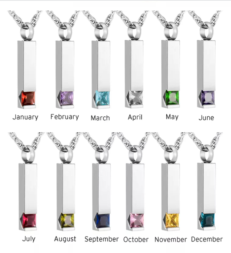 available in 12 different color stones. The ashes necklace holds a small amount of ashes, perfume, flowers or hair. The custom bar