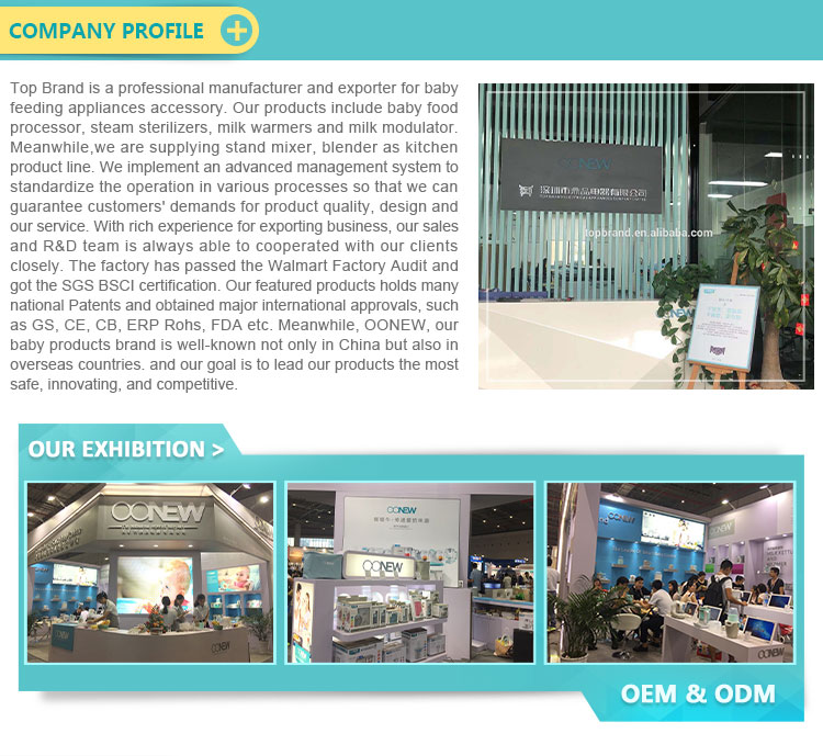 Top Brand is a professional manufacturer and exporter for baby feeding appliances accessory. Our products include baby food processor, steam sterilizers, milk warmers and milk modulator. Meanwhile,we are supplying stand mixer, blender as kitchen product line. We implement an advanced management system to standardize the operation in various processes so that we can guarantee customers' demands for product quality, design and our service. With rich experience for exporting business, our sales and R&D team is always able to cooperated with our clients closely. The factory has passed the Walmart Factory Audit and got the SGS BSCI certification. Our featured products holds many national Patents and obtained major international approvals, such as GS, CE, CB, ERP Rohs,etc. Meanwhile, OONEW, our baby products brand is well-known not only in China but also in overseas countries. and our goal is to lead our products the most safe, innovating, and competitive.