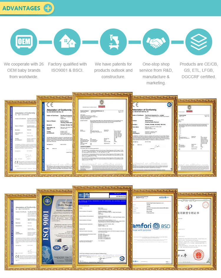 one-stop shop service from R&D, manufacture & marketing; products are CE/CB, GS, ETL, LFGB, DGCCRF certified. Factory qualified with ISO9001 & BSCI. We have patents for products outlook and constructure; We cooperate with 26 OEM baby brands from worldwide.