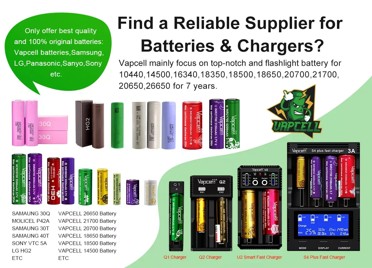 Vapcell Group established in 2013, and mainly engaged in the research and development, production and sales of premium lithium ion battery and chargers for headlight , flashslight , power tools , battery pack etc.