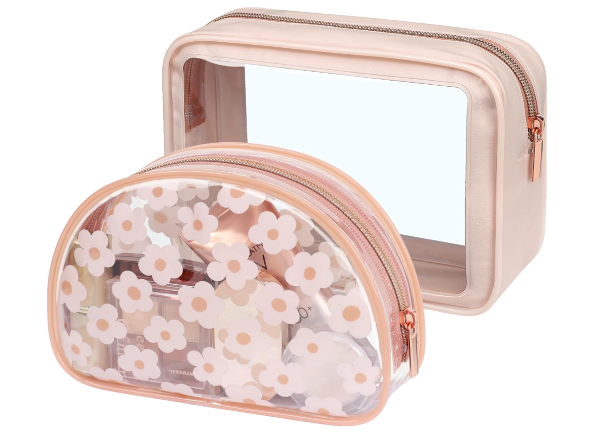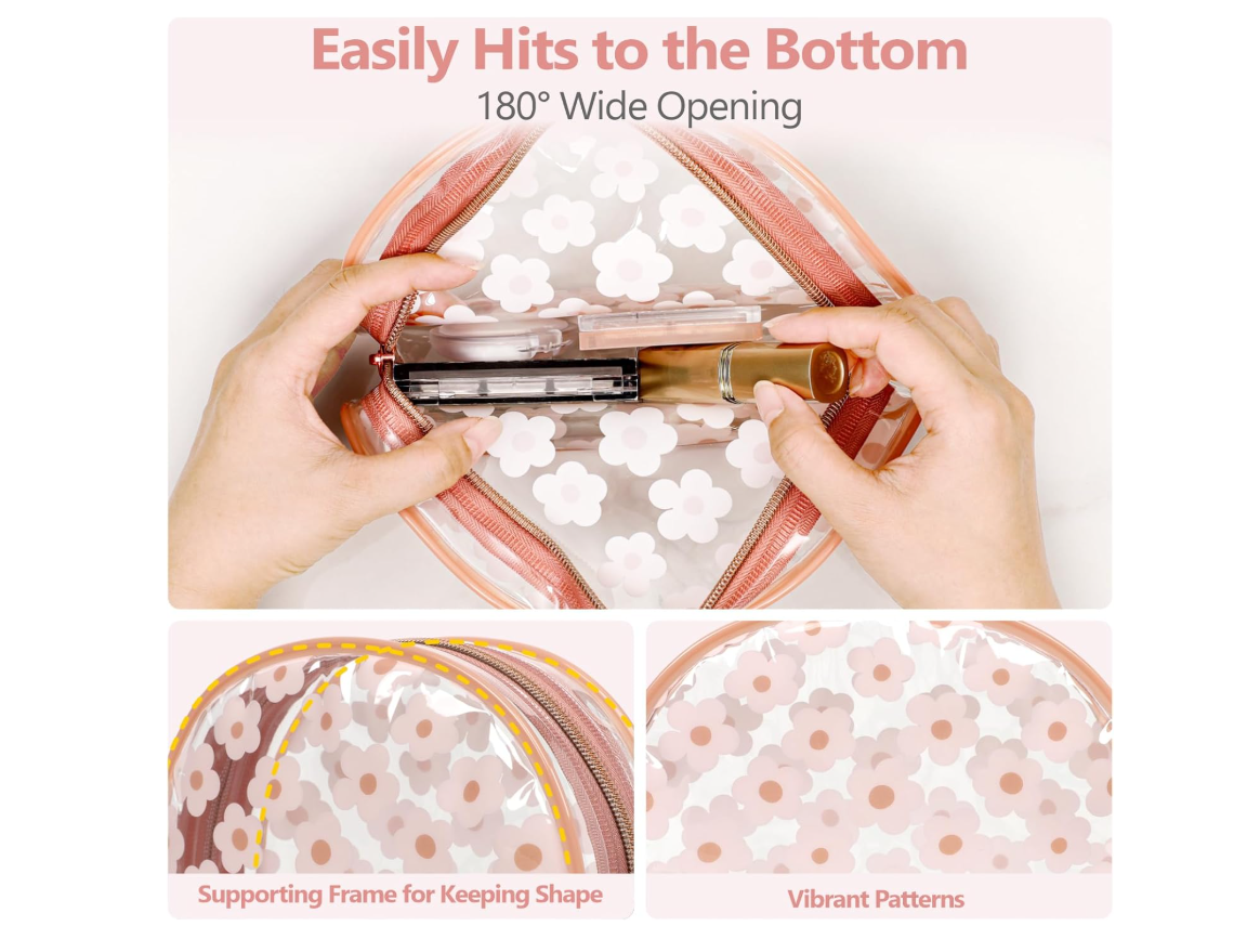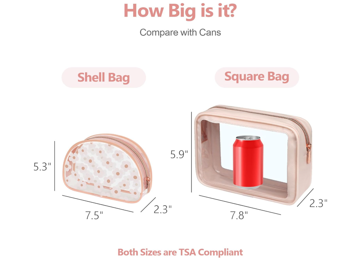 Hassle-Free Pass: Our medium square clear travel bags is 8.07 x 2.35 x 5.91 inches, and the small clear shell bag is 7.48 x 2.36 x 5.31 inches, both complying with the 3-1-1 rules, ensuring a smooth journey through airport security and save your time