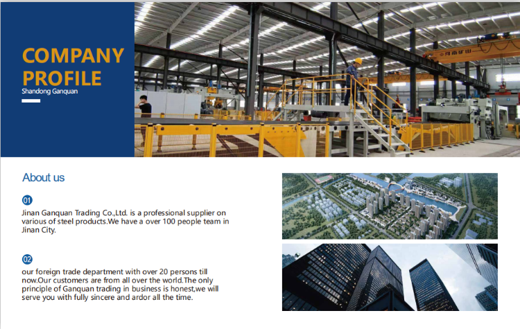 Shandong Ganquan Trading Co., Ltd., located in Jinan, the beautiful capital of Shandong Province, is a company integrating steel export and customized design. The company's main products: H-section steel, I-beam, angle steel, channel steel, flat steel, round steel, galvanized profile, stainless steel and p-section steel. Our precision cold-rolled pipe series has smooth appearance and no oxide layer. It is widely used in automobile manufacturing, petrochemical industry, aerospace, boiler equipment, medical equipment and other industries. Comply with Chinese national standard (GS) and American Standard ASTM.