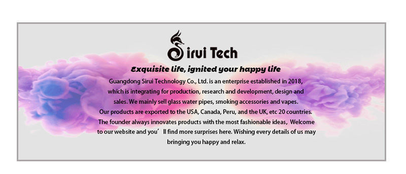 Guangdong Sirui Technology Co., Ltd. is an enterprise established in 2018, which is integrating for production, research and development, design and sales. We mainly sell glass water pipes, smoking accessories and vapes. Our products are exported to the USA, Canada, Peru, and the UK, etc 20 countries. The founder always innovates products with the most fashionable ideas, Welcome to our website and you'll find more surprises here. Wishing every details of us may bringing you happy and relax.