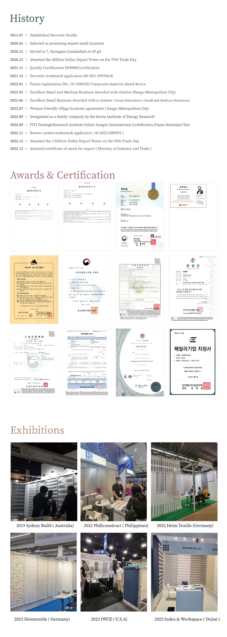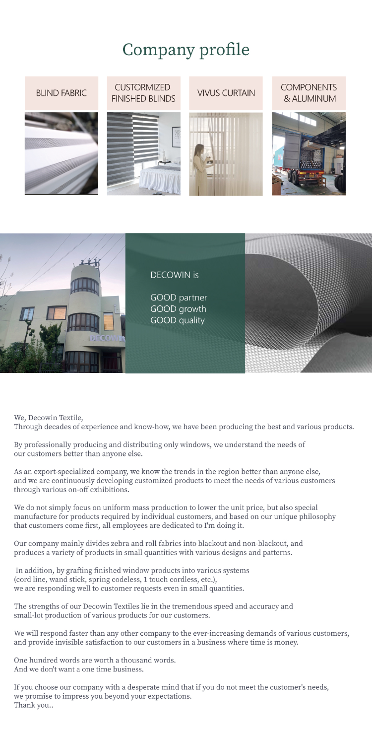 DECOWN is have been producing various blind fabrics for window covering and also make customized finished blinds and curtains since 2011.