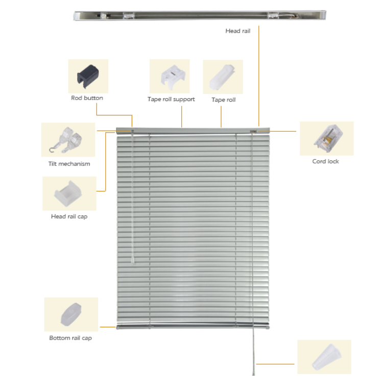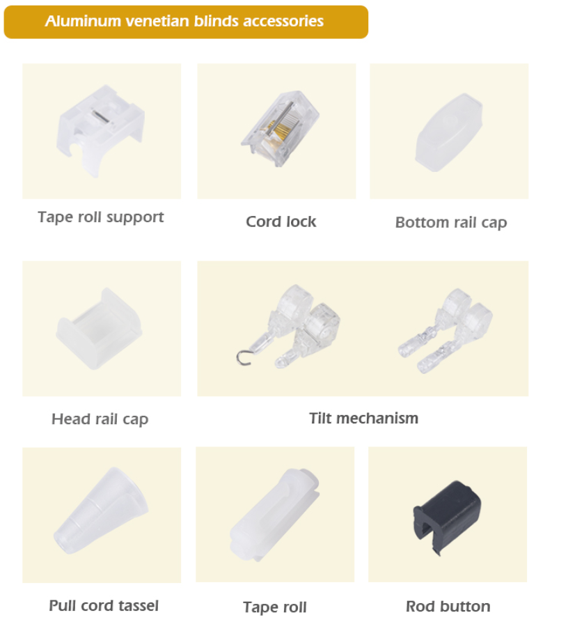 Specification:We can supply all the components of 25 mm Aluminum Venetian blinds.We have tilt mechanism,tape roll,tape roll support,tassel,cork etc.Welcome contact me if you need anything.We also supply aluminum slats,head and bottom rail ,blinds machines.We are manufacturer.We have our factories.