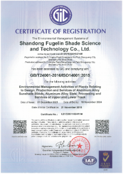 Shandong Fugelin Sunshade Technology Co., Ltd, is the Chinese professional manufacturer of aluminum slats, aluminum venetian blinds, aluminum vertical blinds, magnetic aluminum venetian blinds in double glasses,honeycomb blinds,external aluminum venetian blinds, head and bottom rails, accessories for the venetian blinds, PVC louver,PVC shutters,etc.