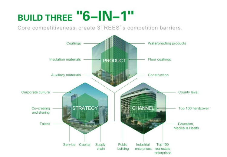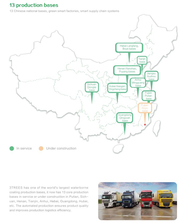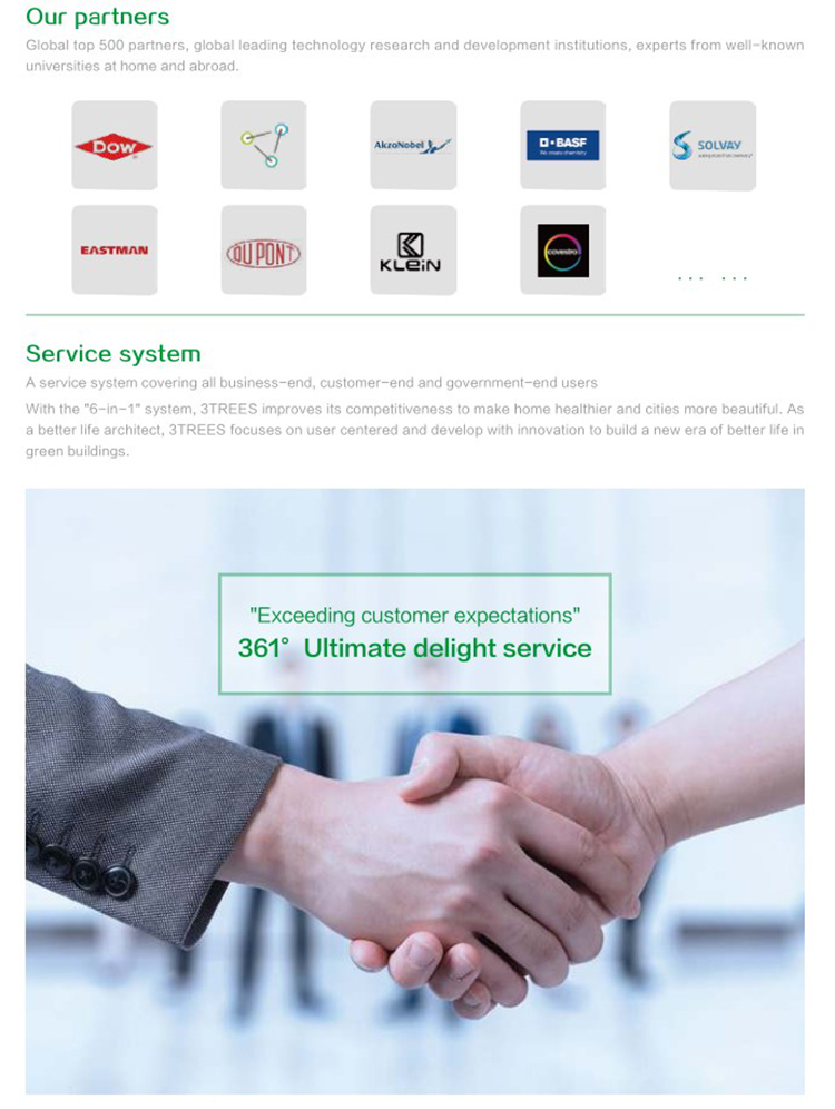 Since its founding in 2002, 3TREES has been committed to building healthy homes by providing an integrated one-stop system of green construction materials and services, including Interior & Exterior Wall Coatings, Waterproofing Products, Insulation Materials, Industrial Coatings, Floor Coatings, Home Decoration New Materials, Auxiliary Materials and Construction in the engineering field. In the retail field, 3TREES provides a better life solution of 7-in-1 products and immediate move-in services including Emulsion Paint, Art Coatings, Beautiful Countryside Coatings, Adhesives, Auxiliary Materials, Waterproof Coatings and Sci-Tech Decorative Board. In 2016, 3TREES was listed on the Shanghai Stock Exchange. In 2019, it was listed on the Hurun China Top 500 Private Enterprises. In 2020, it became the exclusive supplier of official paint for the Olympic and Paralympic Winter Games Beijing 2022, and ranked the 10th place in global coatings listed companies by market value. 3TREES has now become a group with 33 wholly-owned and majority-owned companies. It currently has nearly 10,000 employees and 20,000 cooperative partners all over the world.