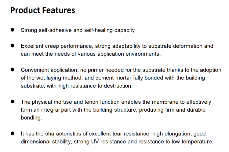 Main Ingredient | High-performance self-adhesive modified asphalt, high-strength imported macromolecular cross film, strippable silicon coated isolation film. |