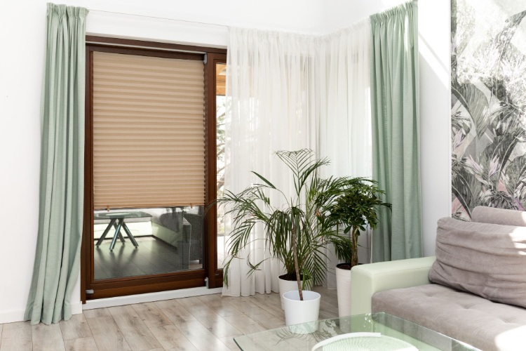 Double-layer zebra curtains combine alternating tulle and plain fabric bands.
