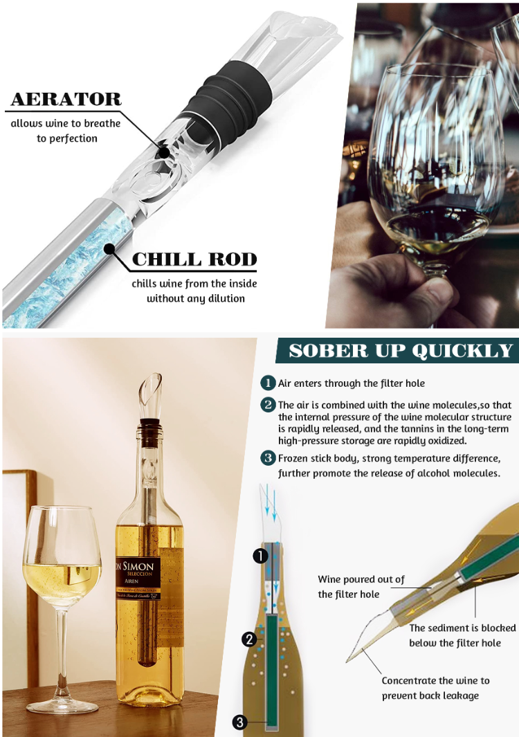 A:Built-in dual intake aerator mixes extra oxygen to maximally enhance wine flavor. Stainless steel wine chiller rod makes the taste of your wine or drink won't be diluted by melting. Drip-free pouring spout to avoid any drips or spills. Plus extra rubber stopper to keep your wine fresh.